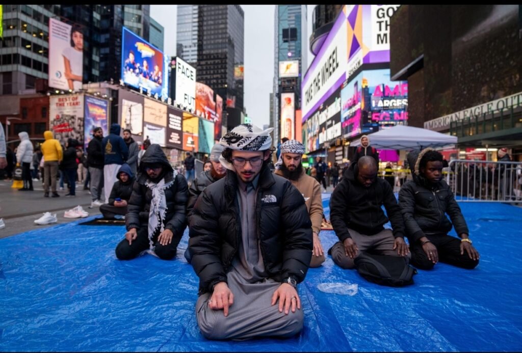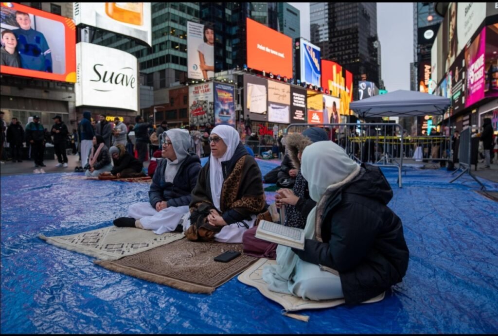 New York, DetikKhatulistiwa.com — Ratusan umat Muslim di Amerika Serikat memadati kawasan ikonik Times Square, New York, untuk melaksanakan salat Tarawih berjamaah dalam rangka menyambut bulan suci Ramadhan. Di bawah sorotan papan reklame digital raksasa dan gemerlap cahaya kota metropolitan, lantunan ayat suci Al-Qur’an menggema khusyuk di salah satu pusat keramaian dunia tersebut.